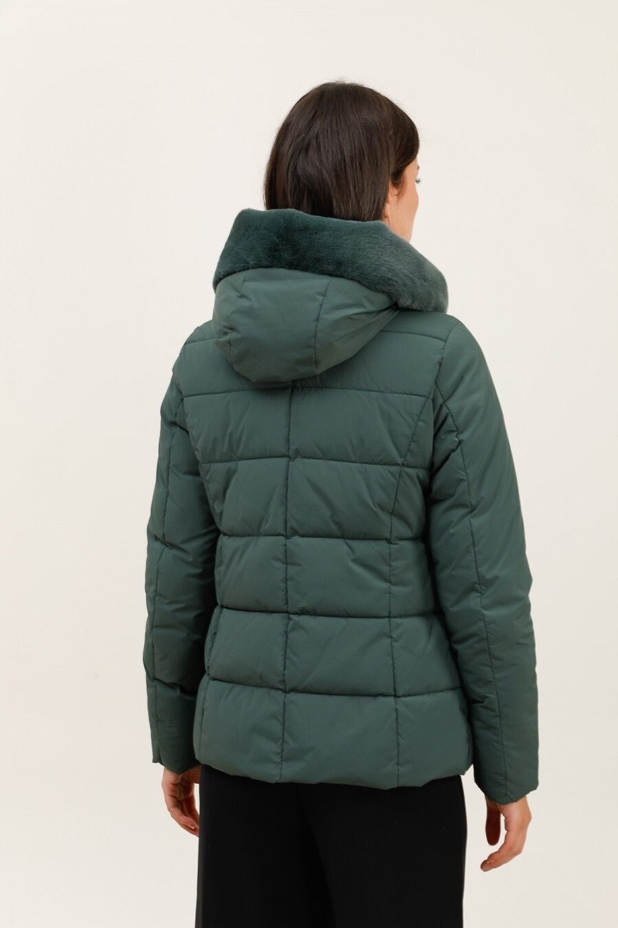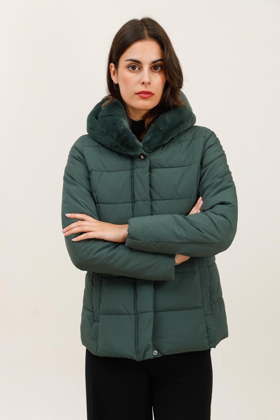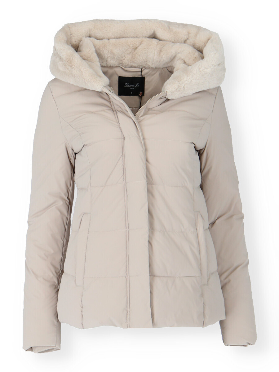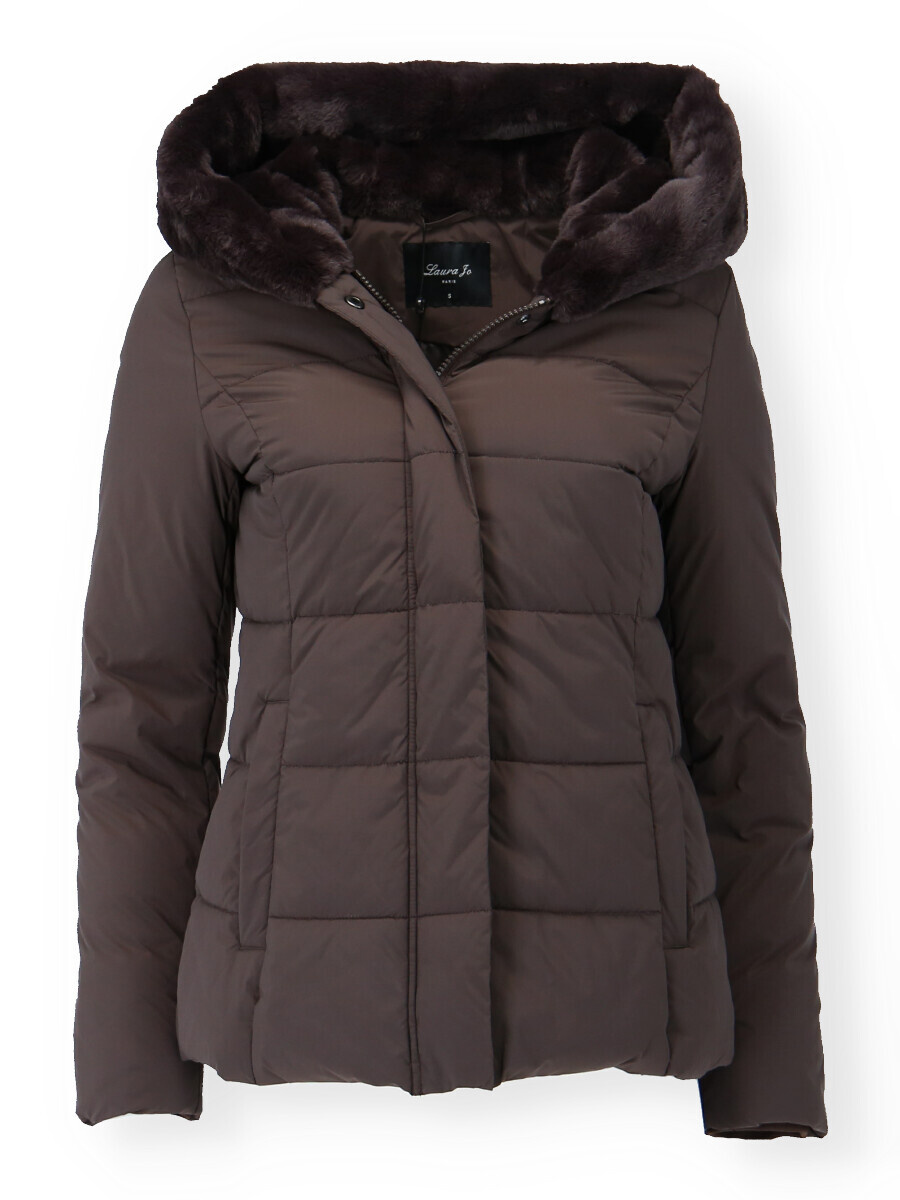 Módní prošívaná zimní bunda krátká. Bunda má zapínání na zip s klopou na druky, kožešinovou kapuci a všité kapsy po stranách.