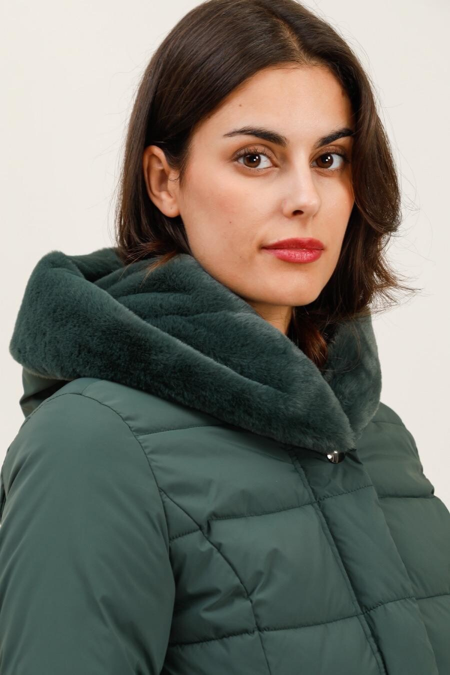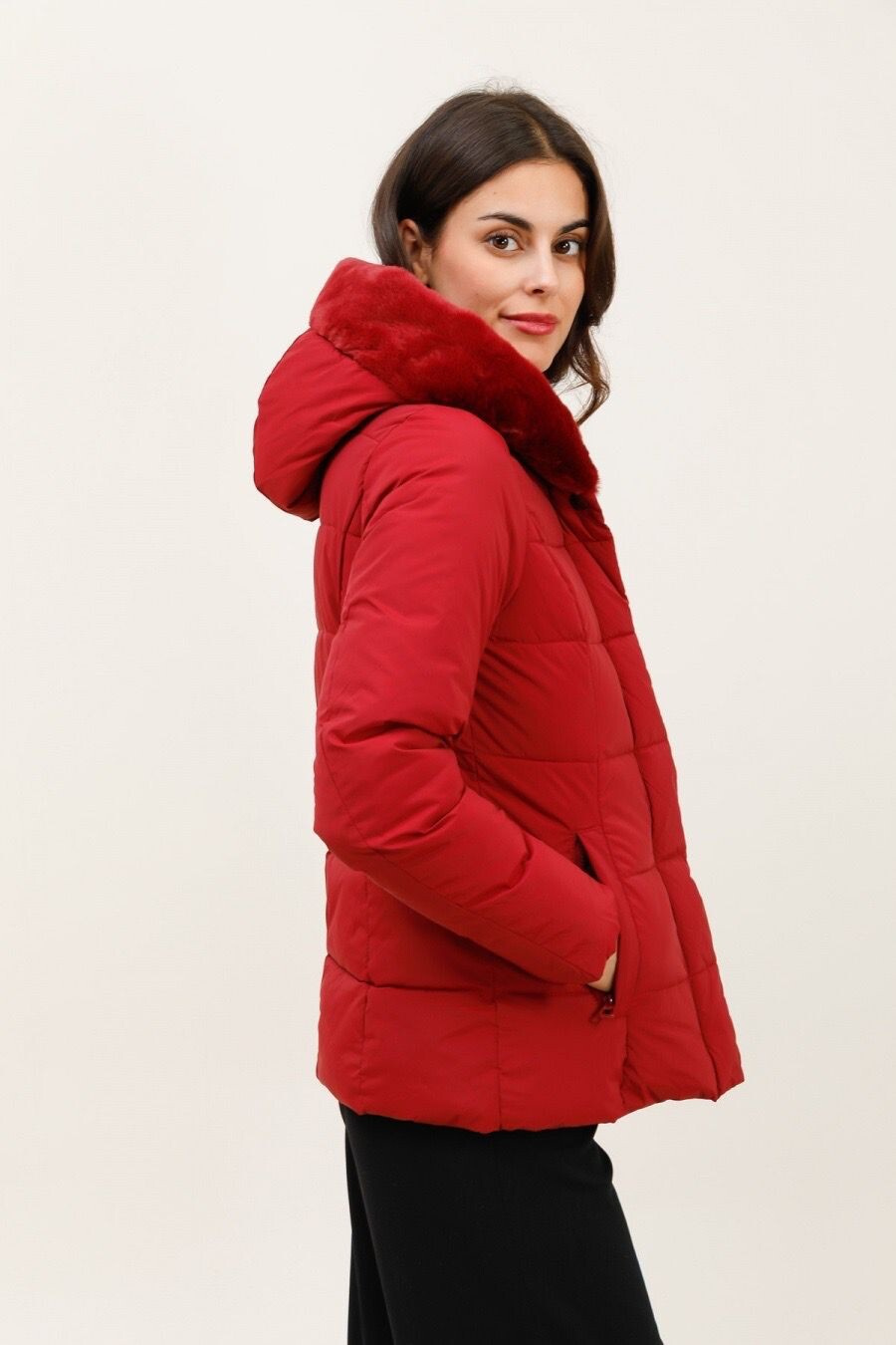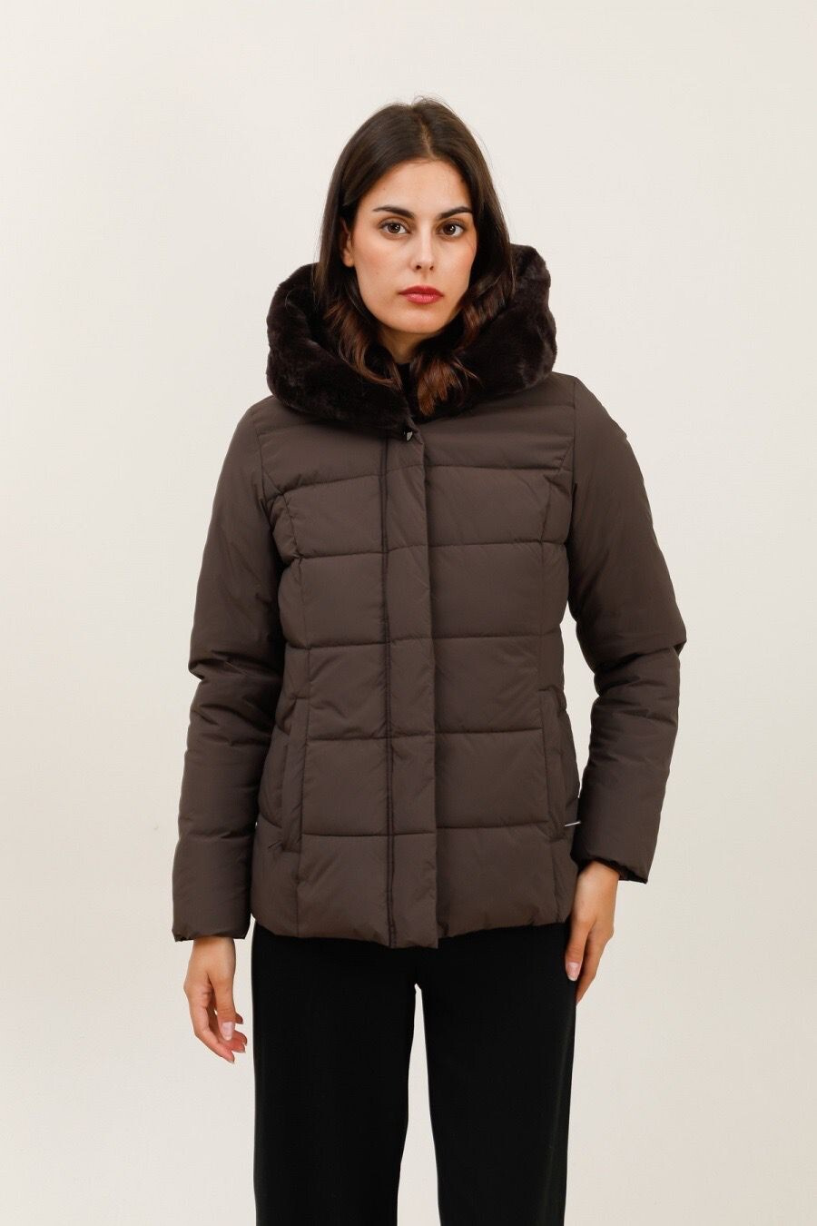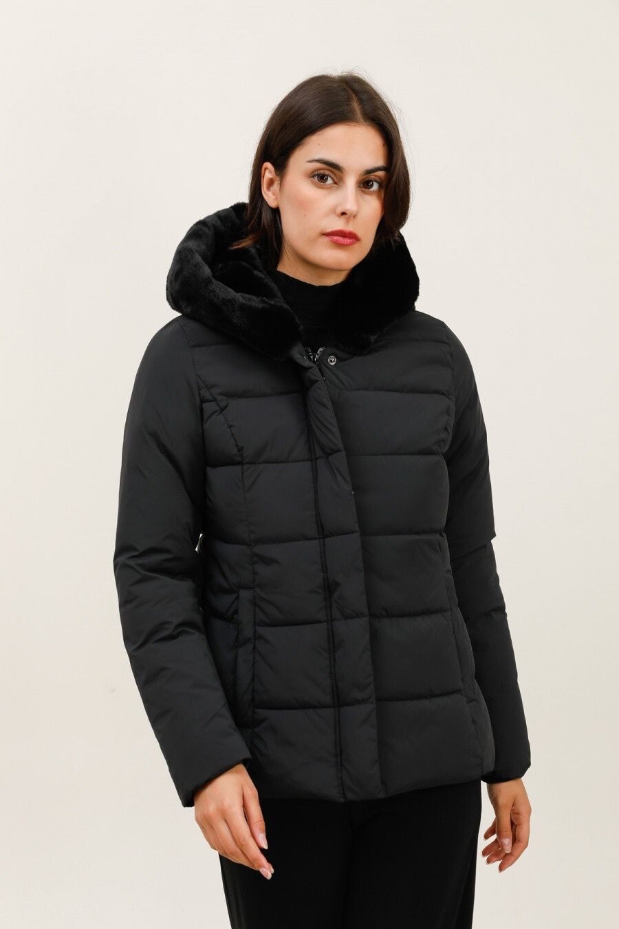 Módní prošívaná zimní bunda krátká. Bunda má zapínání na zip s klopou na druky, kožešinovou kapuci a všité kapsy po stranách.