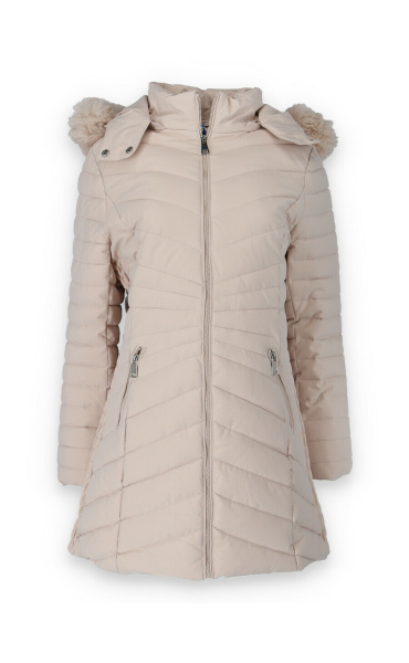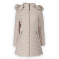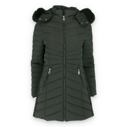Dámská delší zimní bunda s kapucí a gumičkovým úpletem po stranách . Odnímatelná kapuce